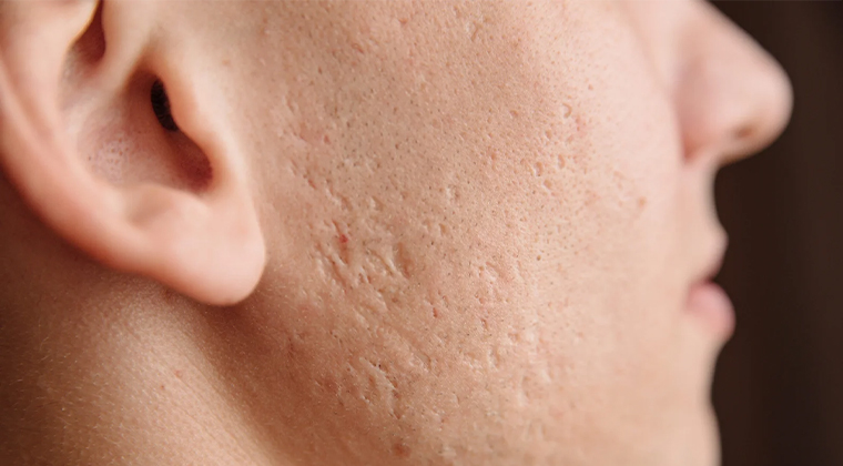 Acné: afección de la piel por folículos tapados que causan granos y puntos. Marcas de acné: cicatrices o manchas resultantes de lesiones de acné.